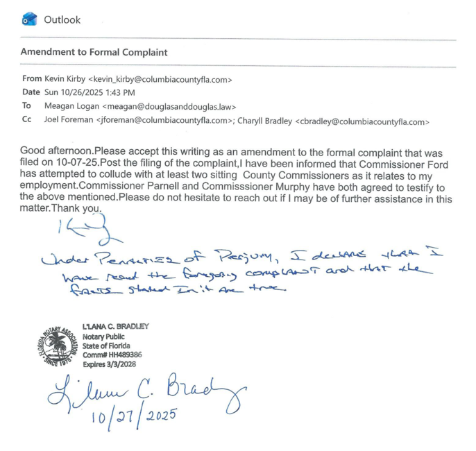 COLUMBIA COUNTY, FL – Kevin Kirby, Columbia County’s Co-Commander, files ethics complaint, including collusion, against County Commissioner Rocky Ford (October 6, 2025).