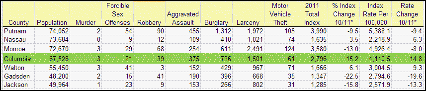 COLUMBIA COUNTY, FL – Yesterday, April 30, 2012, the Florida Department Of Law Enforcement (FDLE) announced the 2011 Annual Uniform Crime Report. According to FDLE, crime is down throughout Florida. In Columbia County, the picture is not the rosy picture initially painted by Sheriff Mark Hunter. The state groups crimes into seven major categories. Columbia County showed an increase of 15.2% between 2011 and 2010.