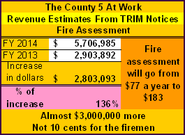 Every place one looks the County has a different set of numbers for the fire assessment. One day they use FY 2013; a few months later the County 5 uses FY 2014; then the County 5 present numbers that change; are revised; are ISO; and finally enhanced.