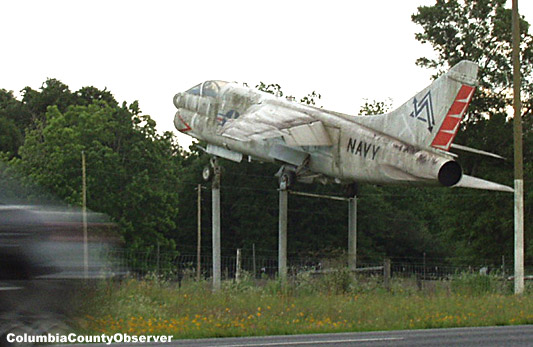 COLUMBIA COUNTY, FL – Last night, the Columbia County 5 (The 5) unanimously voted to contact the Department of Defense for "disposal instructions" for the County's display along I-75 of a Navy A-7 Corsair fighter plane. The 5 have allowed the display to fall into disrepair; the light to go out; and turned the other way as the aircraft became covered in bird excrement.