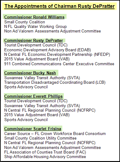 COLUMBIA COUNTY, FL – The new Chairman of the County 5, District 2 Commissioner, Rusty DePratter, has changed who is sitting on the deck chairs of the Columbia County ship of state. After the Bloodless Coup which featured the cover-up of the non- vote which led to the installation of Mr. DePratter as chairman and District 3 Commissioner, Bucky Nash as Vice-Chair, there is movement at The 5.