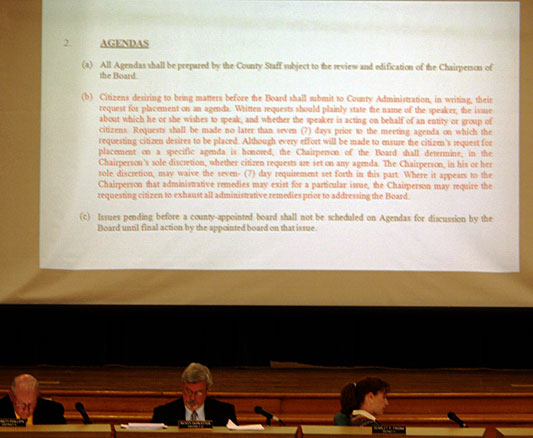 Mr. Foreman's new rules called for all public speakers to come to the microphone and give their name and address to the Clerk over the PA system. Your reporter, who has been complaining about this since the 4 year reign of terror during the term of County Commissioner Jody DuPree (Mr. Foreman was Commissioner DuPree's personal attorney) told The 5 last night that this was the last time he was going to put his street address on a sign-in card, although he would fill out the rest of the information, which was required by Senate Bill 50, requiring Boards to hear speakers and that speakers give their name.