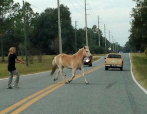 On December 3, 2014, The Lake City Reporter published its "courtesy" photo. It showed a yellow horse in the middle of a country road, with Samantha Haake trying to corral the horse.