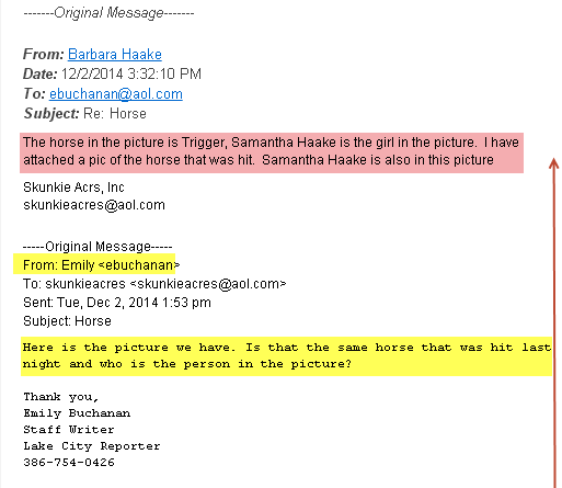 On December 2, 2014, at 1:53 pm, the Lake City Reporter's cub reporter, Emily Buchanan, called and emailed Skunkie Acres. Ms. Buchanan emailed a photo and asked: "Here is the picture we have. Is that the same horse that was hit last night and who is the person in the picture?" The Lake City Reporter was preparing an article on the collision between a car and a Skunkie Acres horse that was on the highway.