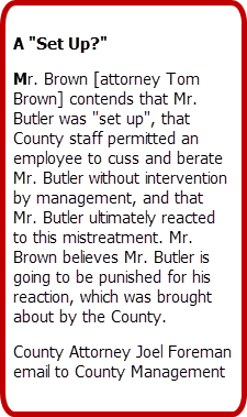 Subsequent calls revealed that there was some kind of scuffle at the County offices on the morning of July 24, 2015. Those involved were Acting County Manager, Ben Scott; Assistant County Managers Kevin Kirby and the newly hired Scott Ward; IT Director, Todd Manning (by cell phone); and Mr. Butler.