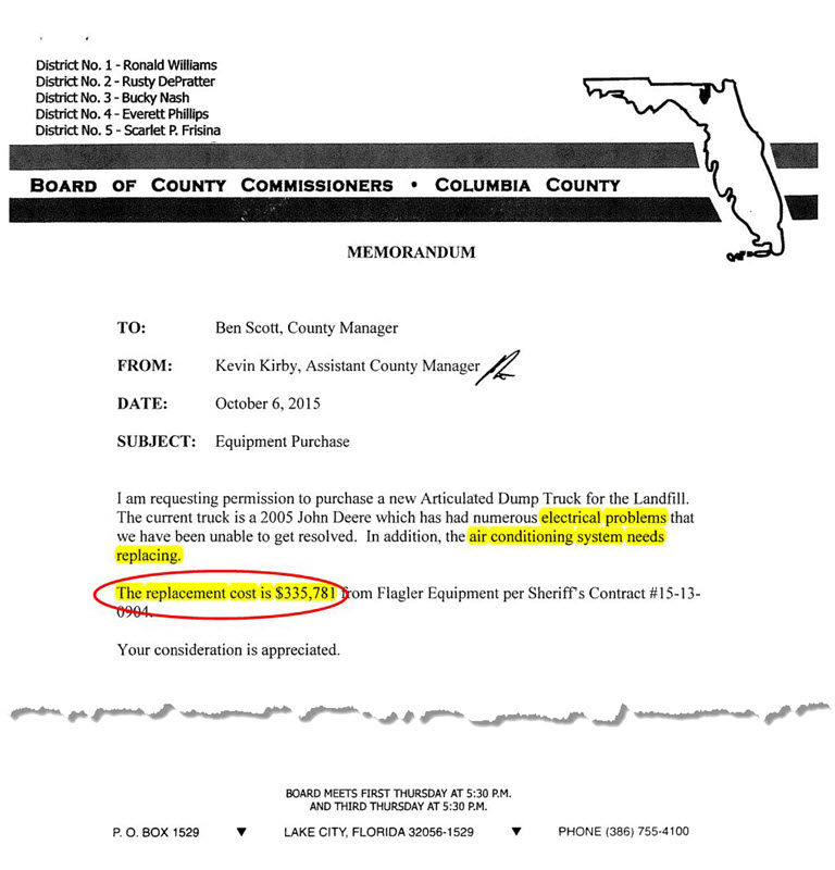 In the October 15, 2015 Consent Agenda, Mr. Kirby claimed, in an October 6 memo, the Landfill dump truck "air conditioning system needs replacing." He did not explain what that meant, nor did he give the cost.