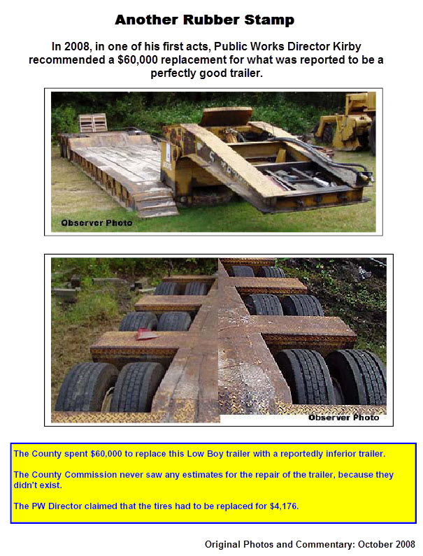 In 2008, shortly after Mr. Kirby was hired, the County decided to surplus a $60,000 heavy equipment trailer that sources claimed didn't need replacement. There was also other County equipment that went on the auction block that was privately questioned.