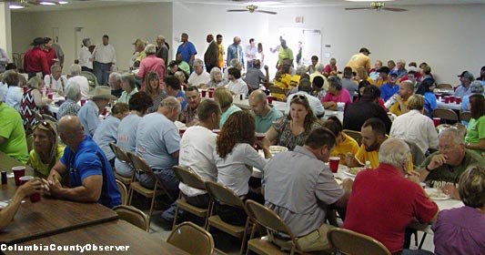 FORT WHITE, FL – A malfunctioning air conditioner didn't dampen the spirits of the throng of folks that turned out to support their favorite candidates at the first Republican meet the candidate night in Columbia County. The Democrats have no presence and Master of Ceremonies, Republican leader Buddy Hines, ran a mostly non-partisan event, other than the cake auctions, where all the money went to the republicans. The cake auction turned out to be where the action was. Running unopposed, Sheriff Hunter got blown out of coconut cake auction ($320) and a couple of other ones. Finally, he donated $100 and said he would try again at the next candidate night. Keep your eye on the coconut cake and the Sheriff at the next event.