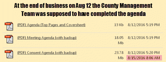 One of the jobs of County Management is timely preparation of agenda and supporting material. This enables The 5 to know what is going on and the public to be knowledgeable about what is going on.