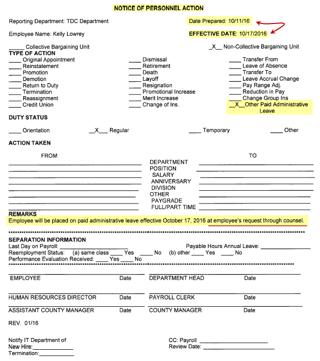 Last night at the County 5, your reporter had a question regarding Mr. Lowrey's administrative leave. "The NOPA, when Mr. Lowrey went out on administrative leave, why wasn't that [an executed copy] in the personnel file? (silence) He was on administrative leave – the County was paying him regardless of what happened with this arrangement – Why wasn't that in his personnel file?"