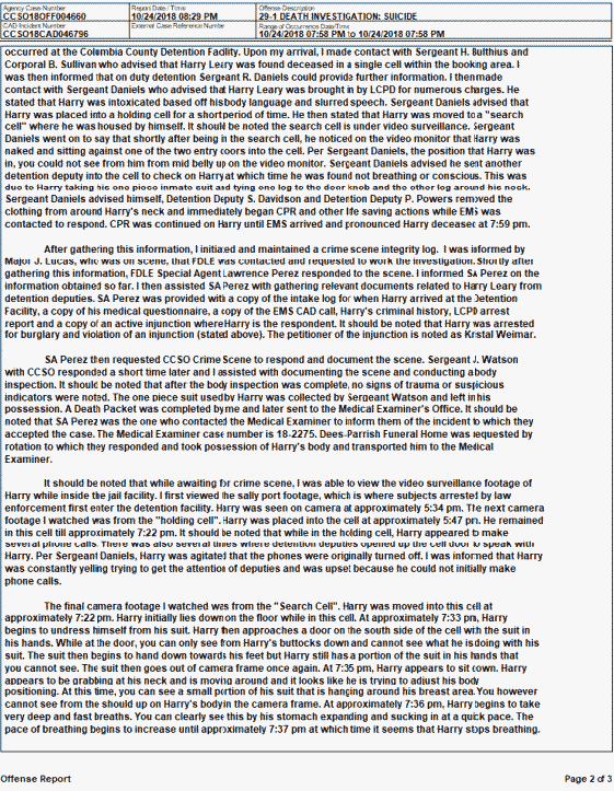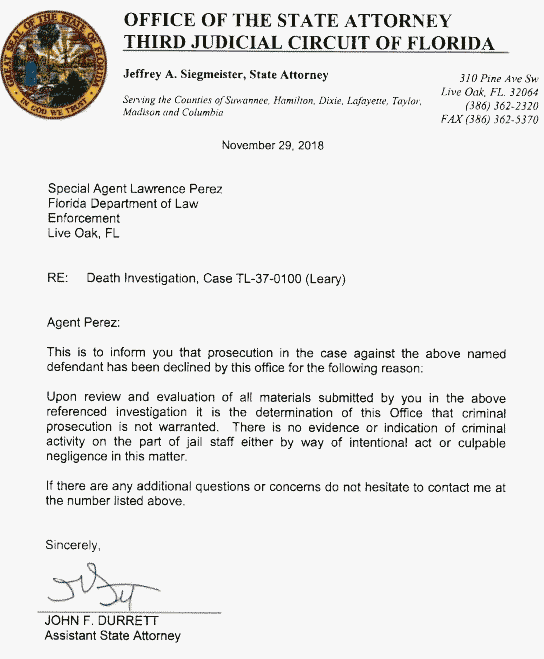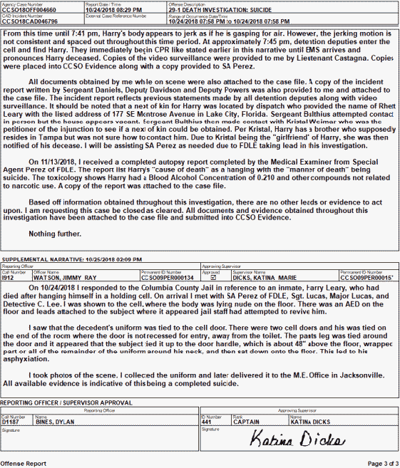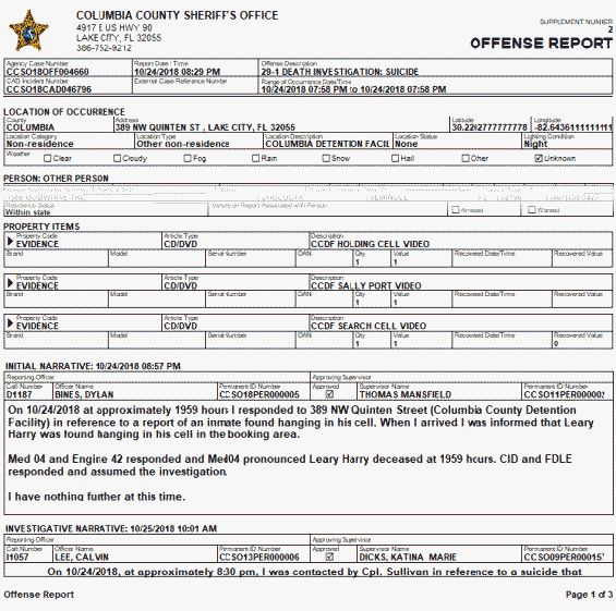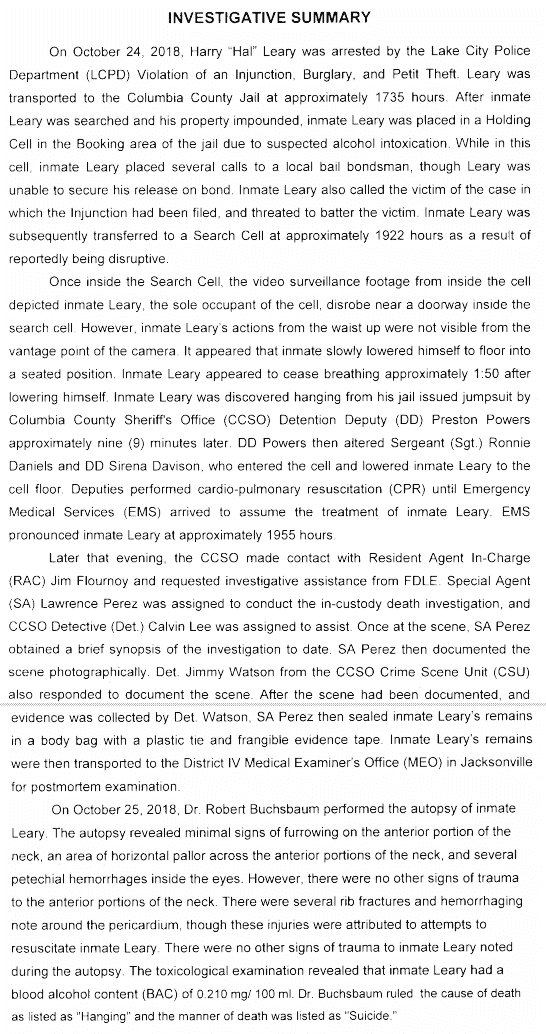 Today, Larry Auger, the Columbia County Sheriff's Office Public Record Access Officer, released the incident report; a statement from Assistant State Attorney John Durrett; and an investigative summary which concluded there was no wrong doing by jail personnel.
