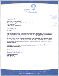 Yesterday afternoon, your reporter asked City Manager Joe Helfenberger, "Who suggested the City ask Columbia County for a quitclaim deed for Olustee Park?"