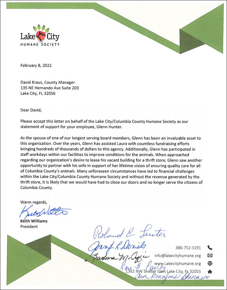 The letter concludes: “Many unforeseen circumstances have led to financial challenges within the Lake City/Columbia County Humane Society and without the revenue generated by the thrift store; we would likely have had to close our doors and no longer serve the citizens of Columbia County.”
