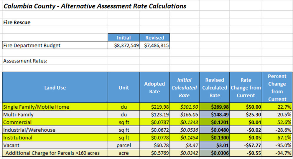 County Manager David Kraus: “We are going to recommend an increase -- to lower the increase -- from $80-$50 residential; we are recommending a $50 residential assessment… In terms of the fire assessment, if we go with the $50 rate, it will generate $7,486,315. From that, you take your exemptions and exclusions, and this is what all your rates would look like."