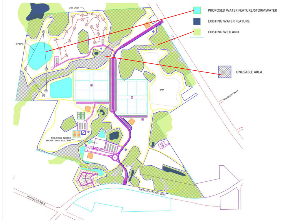 Not to be deterred, the County decided it wanted to get into the eco-tourism business and develop a site with zip lines, a nature walk, and other ecological stuff. The site would also include the flat fields, which was the original plan and was now five years behind.