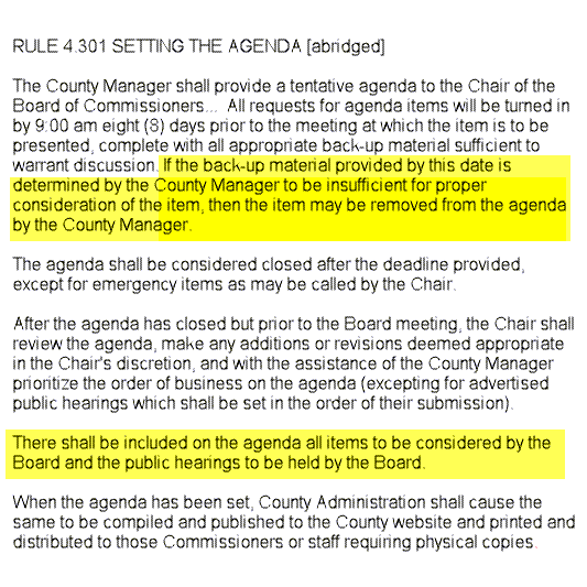 The County rule concerning agenda preparation is clear, in writing, and approved: Agenda material with backup must be turned in 8 days before a scheduled meeting. Once the meeting is published to the County website (required by the County Charter) the agenda is closed except for emergency items.