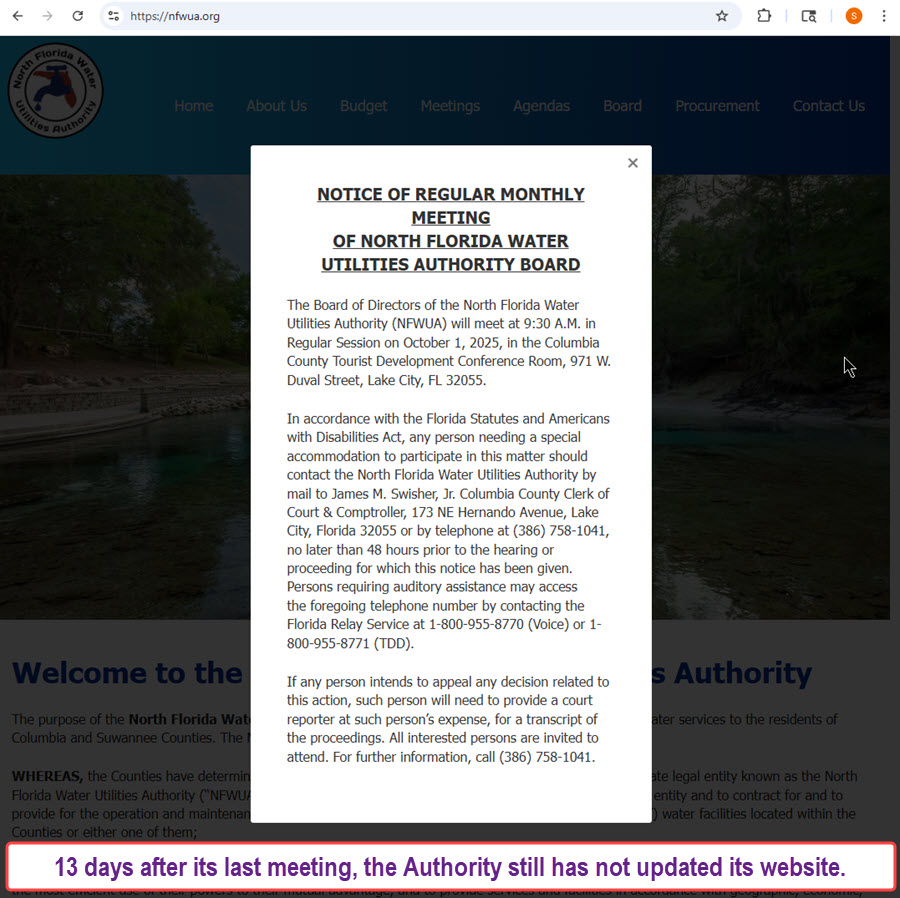 A subsidiary presenter at the meetings was Shannon Roberts, the Executive Director of the fledgling North Florida Water Utility Authority (NFWUA or Authority). Thirteen days after its last meeting, the Authority still has not updated its website.