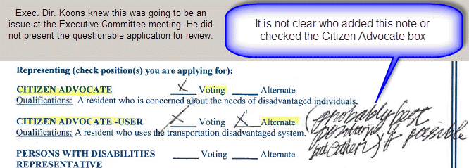 The application which the volunteer completed had a note from either the candidate or the Planning Council regarding the Citizen Advocate-User position: "Probably best position if possible, but other OK."