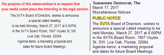 The mandatory requirement for the Suwannee Valley Transit Authority to advertise it meetings in a newspaper where legal notices are advertised is embedded in the Florida statues.