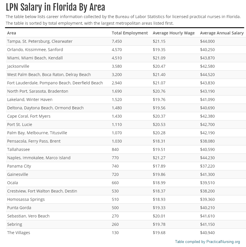 The Bureau of Labor Statistics (BLS) reports favorable employment trends for the field through the year 2026, predicting a 12% increase. In addition to this, Florida LPNs earn an average hourly wage of $20.65, or $42,960 per year.
