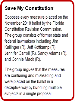 Save My Constitution opposes this measure, as well as every other measure placed on the November 2018 ballot by the Florida Constitution Revision Commission. The group consists of former state and federal lawmakers including Jim Kallinger (R), Jeff Kottkamp (R), Jennifer Carroll (R), Sandy Adams (R), and Connie Mack (R). The group argues that the measures are confusing and misleading and were placed on the ballot in a deceptive way by bundling multiple subjects in a single proposal.