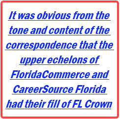 It was obvious from the tone and content of the correspondence that the upper echelons of FloridaCommerce and CareerSource Florida had their fill of Florida Crown.