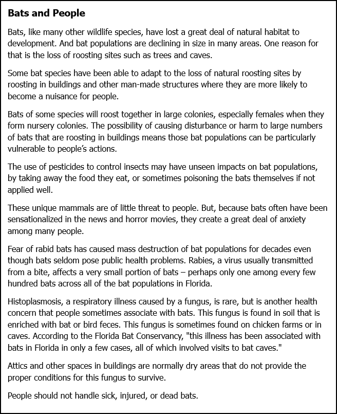 It is illegal in Florida to kill or harm bats, so guidelines were developed to ensure bats are removed safely and effectively from buildings outside of maternity season.