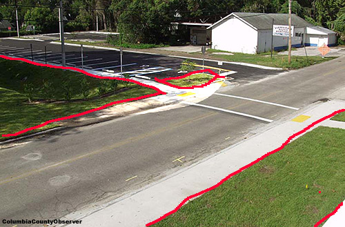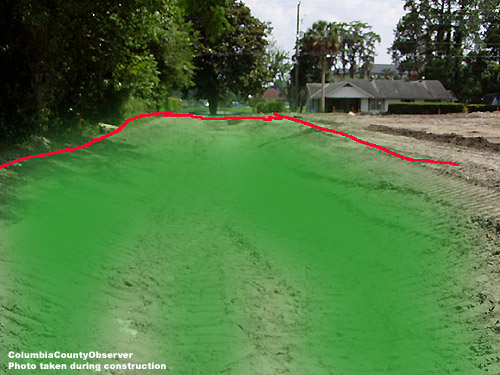 This photo was taken during construction of the parking lot. It is not clear if this area is irrigated. Outline and green added by the Observer.