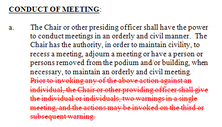 Board member Marc Vann, of the Vann Clan, inquired to be certain that a member of the public could be removed from a Lake Shore Hospital Authority Board meeting without any warning. After Manager Berry assured him that this was the case, the new rule passed unanimously.
