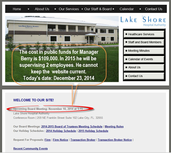 COLUMBIA COUNTY, FL – A little over two weeks ago on December 8, Governor Scott's Lake Shore Hospital Authority Board, relying on the approved Authority policy, told Authority Manager Jack Berry to keep the Authority open on the Fridays after Christmas and New Year's. A request by Hosp Auth Manager Berry to close the Authority on Friday, December 26, and Friday January 2 was denied by the Authority Board. On Friday, December 19, an undated, unsigned sign hanging from the front door of the Authority said the Authority was closed on December 26.
