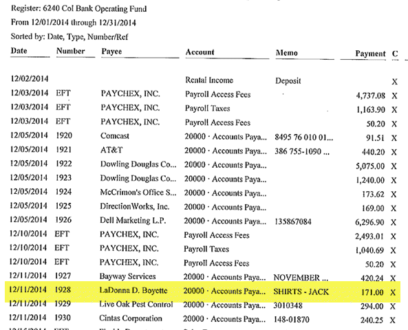 On January 20, 2015, Barbara Lemley visited the Authority Hdq. She requested a copy of the invoice for the shirts. She misstated the check number to be 198 instead of 1928.