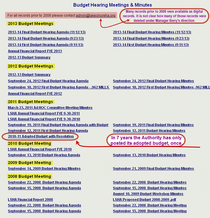 Besides not posting the Lake Shore Hospital agendas, Manager Berry has not posted the Authority budgets, other than the 2011 budget.