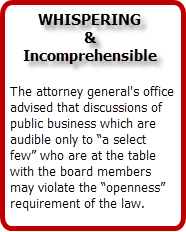 Whispering has been frowned upon by the Attorney General and appeared to be a violation of at least the spirit Florida's Sunshine Law. It is not clear what Mr. Foreman, who was sitting close by, or any of the other Board members heard.