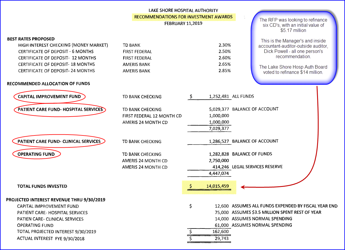 On February 8, Manager Williams finalized his "Award Recommendation – Cash Investments (CD's)." It is not clear if he emailed his recommendations to the Board members or if they had them prior to the February 11 meeting.