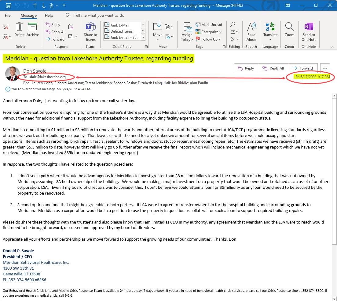Mr. Savoie's correspondence begins: "From our conversation you were inquiring for one of the trustee's if there is a way that Meridian would be agreeable to utilize the LSA Hospital building and surrounding grounds without the need for additional financial support from the Lakeshore Authority, including facility expense to bring the building to occupancy status."