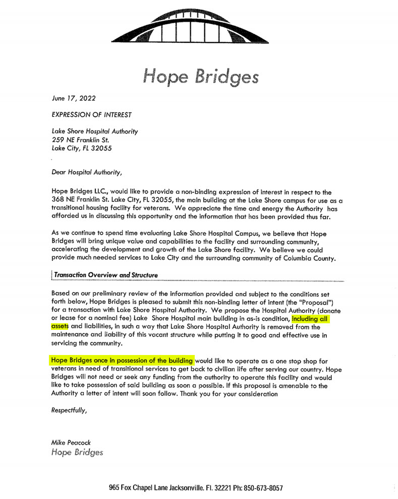 On June 17, Mike Peacock (Hope Bridges) changed his proposal for the vacant hospital to what is a one-sentence "Expression of Interest" to use the hospital building "as a transitional housing facility for veterans." There was no explanation.
