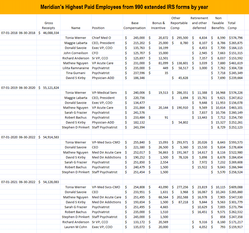 The last four years of remuneration for Meridian's highest-paid employees is in the spreadsheet above. This does not include all the people making over $100,000 a year, just the ones Meridian lists on a separate schedule of the highest paid.