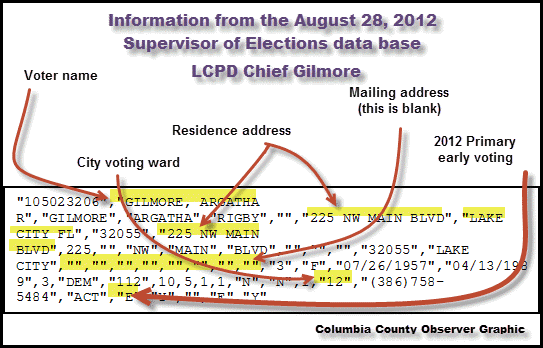 The most recent Columbia County Supervisor of Elections data base dated August 28, 2012, clearly shows that "Argatha Gilmore" voted early in the August 14th primary and that she voted in Lake City's District 12, using as her residence, the Lake City Police Department Headquarters.