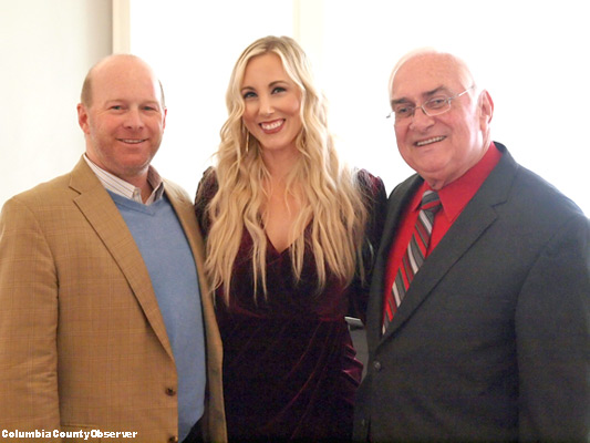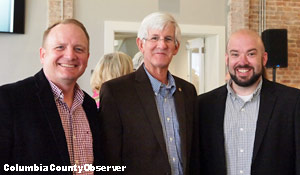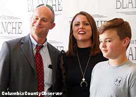 Before the ribbon cutting, developer Rhett Holmes, Dennille Decker, the face of the Blanche during construction, and Mayor Steve Witt (right) took a moment for a photo. The smile came easy, as all were glad that the Blanche doors were being officially opened.