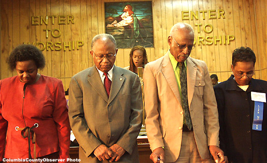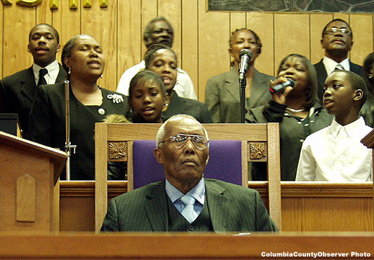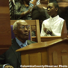 As the Mt. Pisgah choir sings, Rev. Simon quietly
