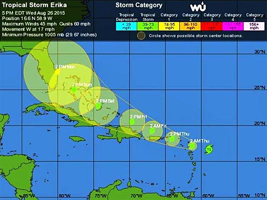 At one point in August, nearly all of Florida was in Erika’s Cone of Uncertainty (or, as I like to think of it, the Cone of Death!) The National Hurricane Center’s cone/track showed the storm crossing the Atlantic and achieving hurricane status just before making landfall in the vicinity of Broward and Palm Beach counties.