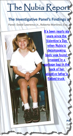 It’s been nearly six years since the Valentine’s Day when Nubia’s decomposing body was found, wrapped in a garbage bag in the back of her adoptive father’s flatbed truck. As usual, when the headlines are sufficiently shocking, a Blue Ribbon Panel was convened to quiet the media mob and appease the legislature. Also, as usual, the underpaid, overworked people who were “pressured” to get the twins off the state’s books and into a “forever family” are long gone to who -knows- where.
